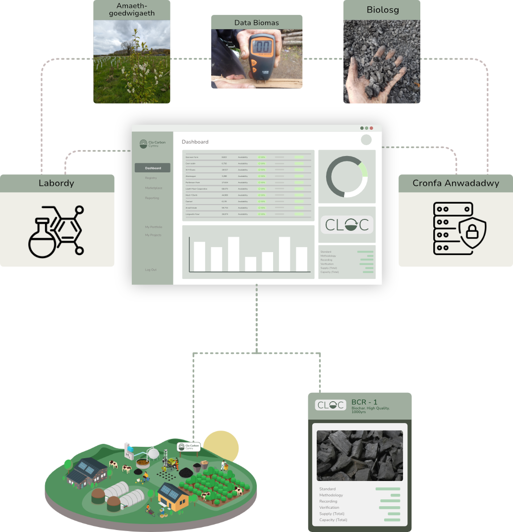 • Delweddu Effaith Tynnu carbon wedi'i fapio i ffermydd/rhanbarthau penodol